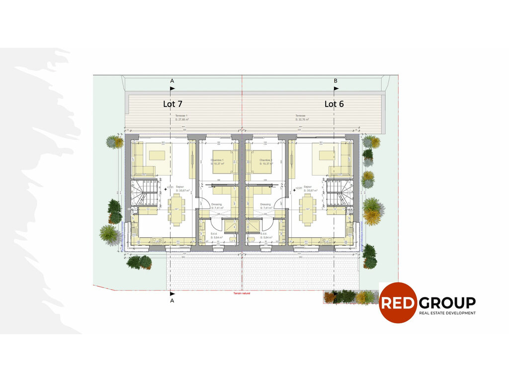 Une accueillante pièce de vie lumineuse d'environ de 35m2 avec accès terrasse et jardin poursuit la réalisation d'une spacieuse chambre parentale de plus de 20m2 ouverte sur dressing et salle de douche offrant l' accessibilité à la terrasse de part ces grandes baies vitrées.